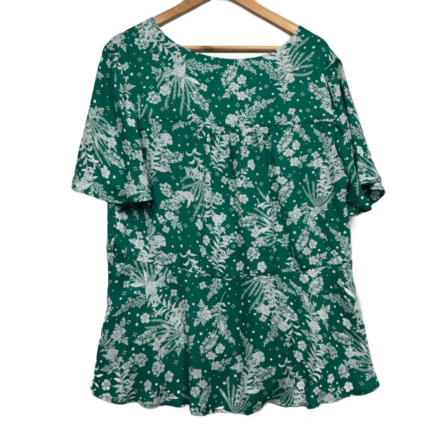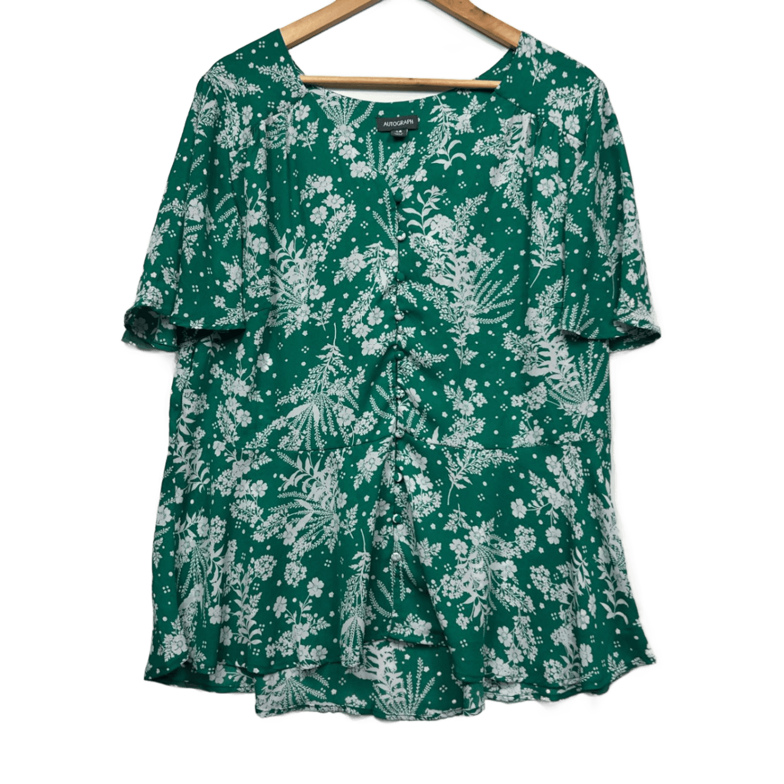 Autograph Green Short Sleeve V-Neck Floral Button Up Peplum Top Size 14