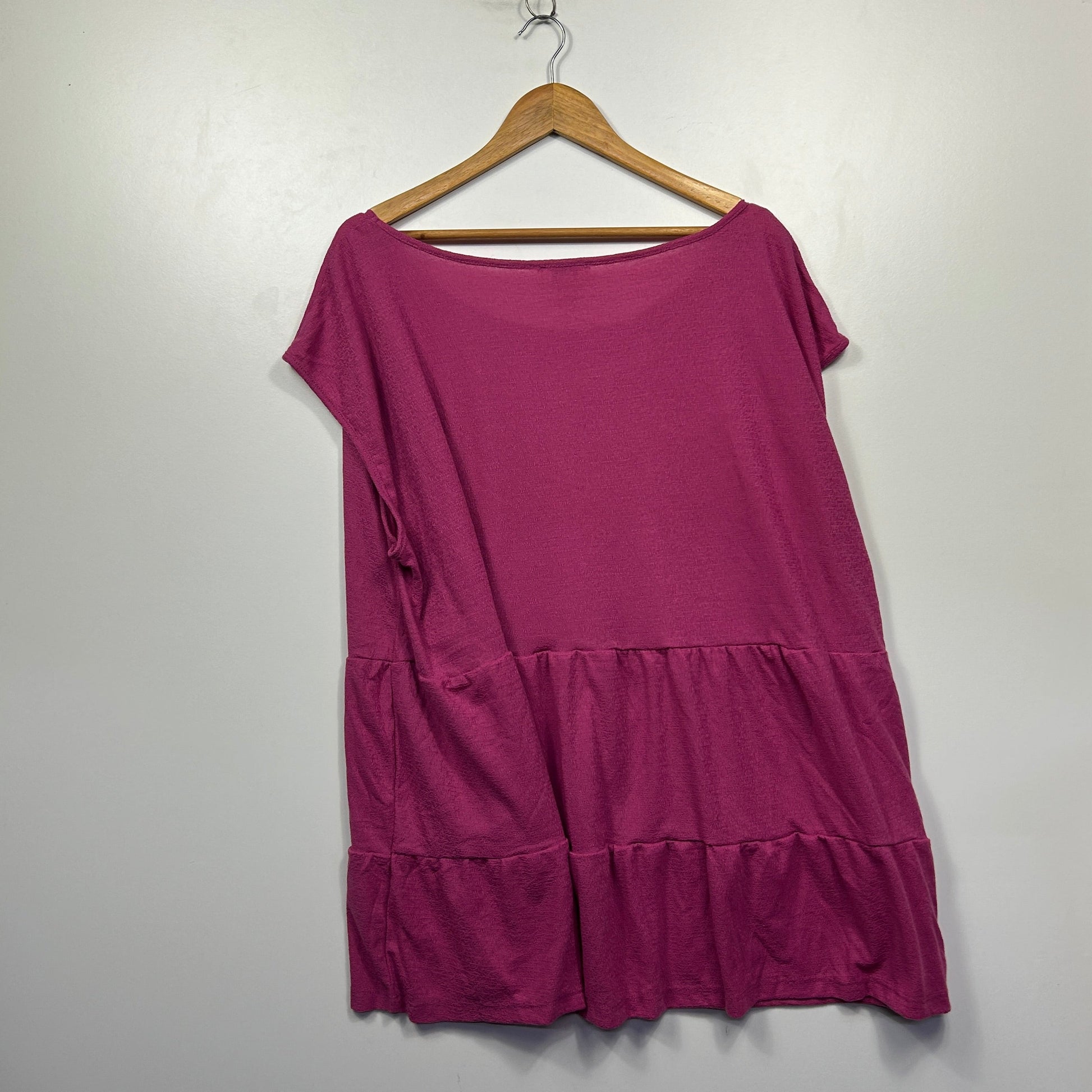 Fuschia pink tiered swing top with boat neckline and short sleeves.