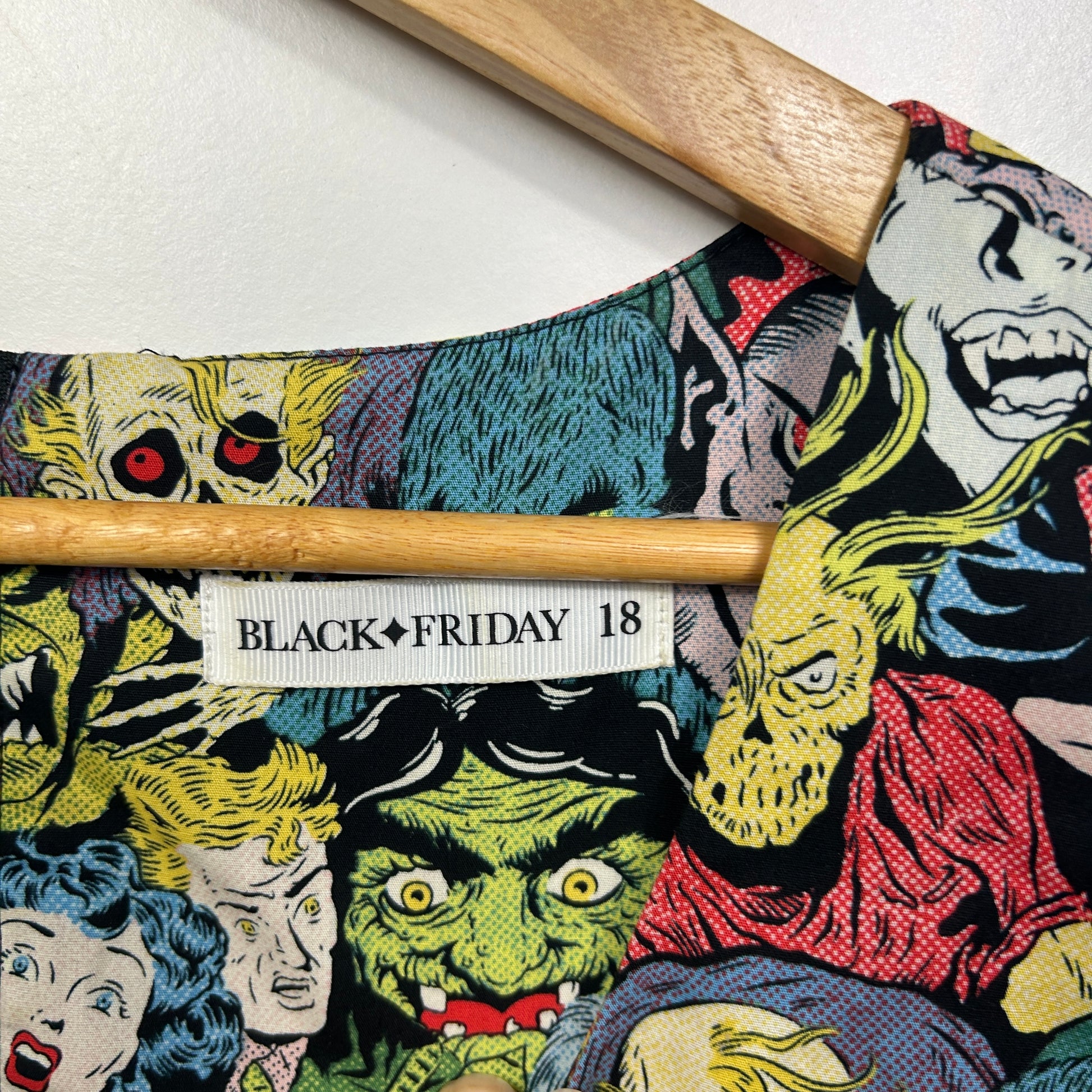 Black Friday Multicoloured Horror Comic Print Sleeveless Dress - Size 18