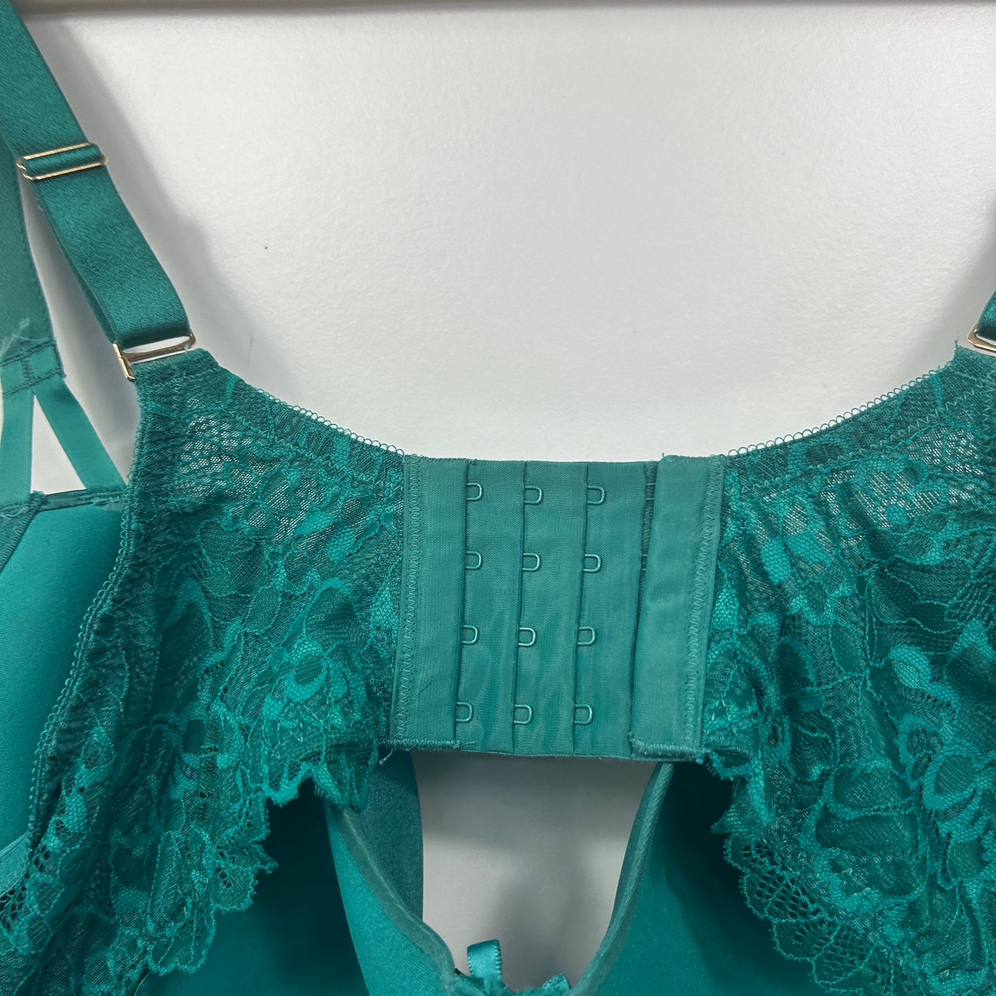 A stunning teal green lace bra featuring elegant floral lace overlay, gold hardware accents, wide adjustable straps with gold sliders, underwire support, and a secure hook and eye closure.