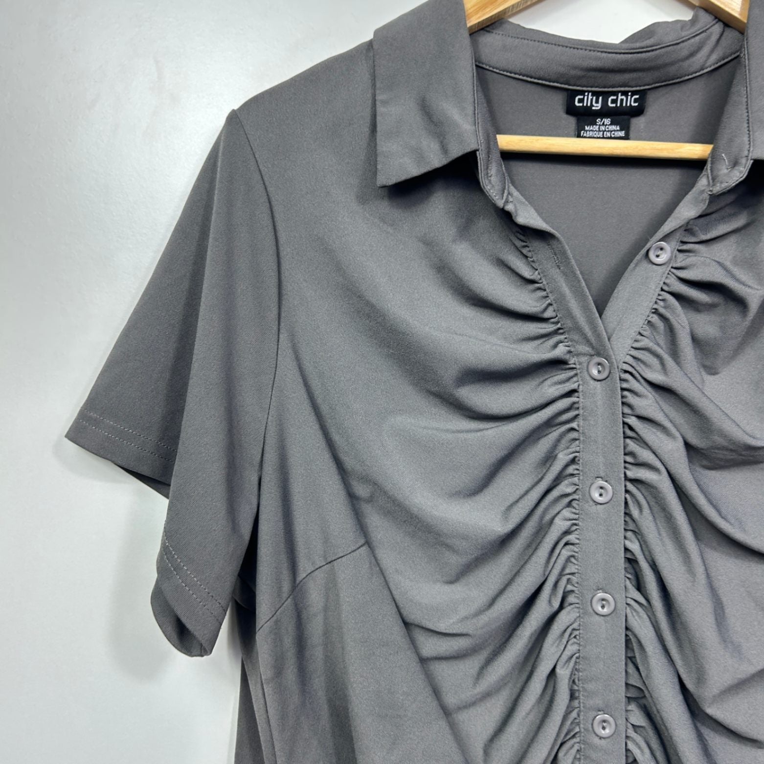 City Chic Womens Grey Short Sleeve Collared Button up Ruched Top - Size 16