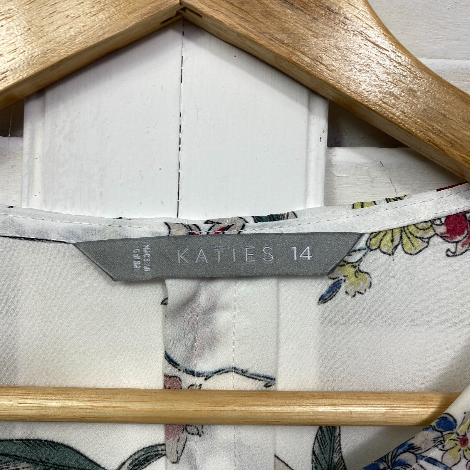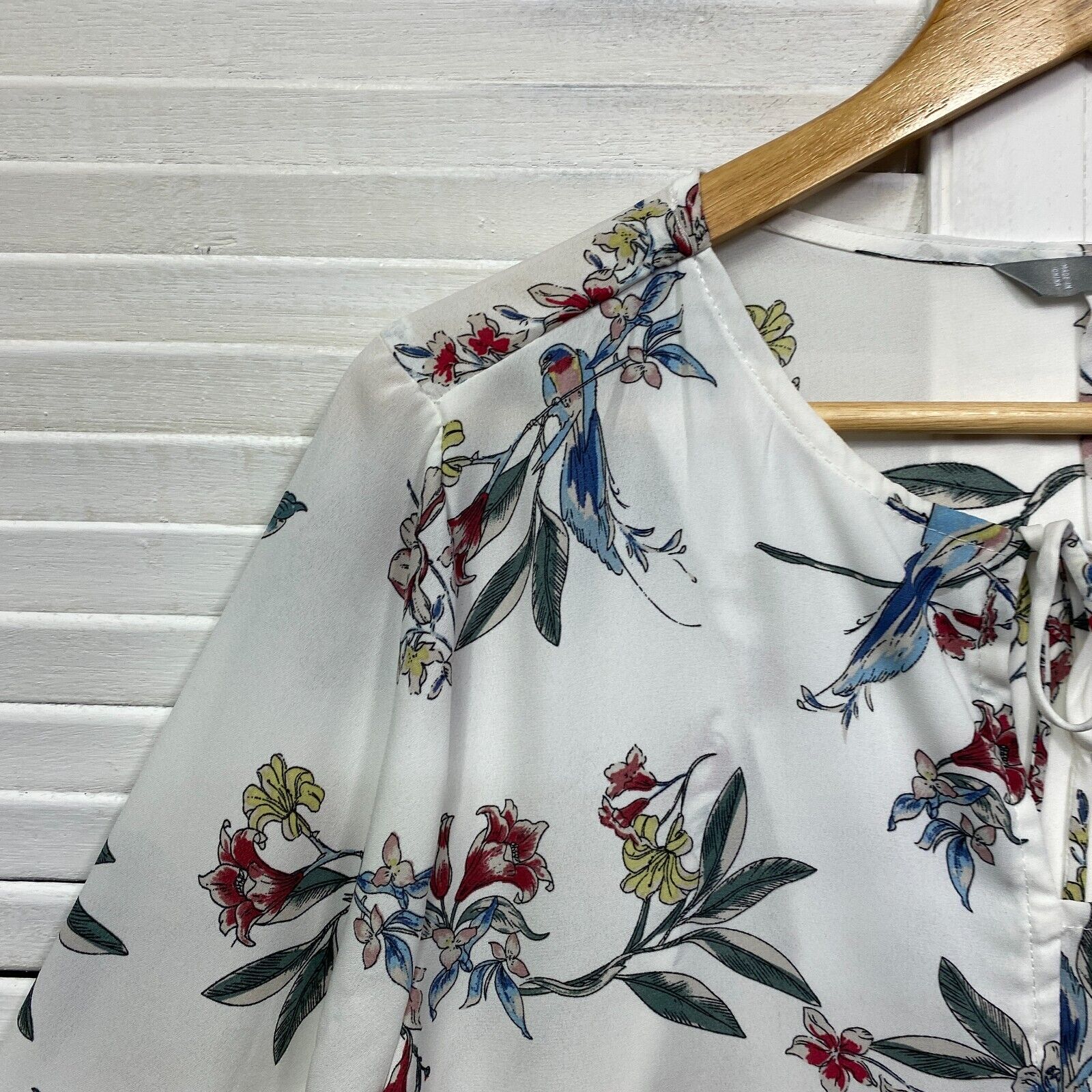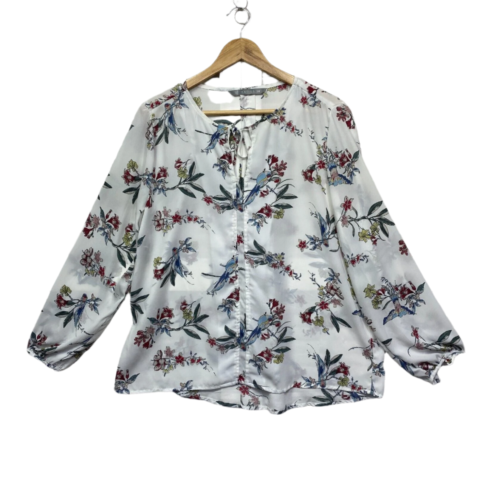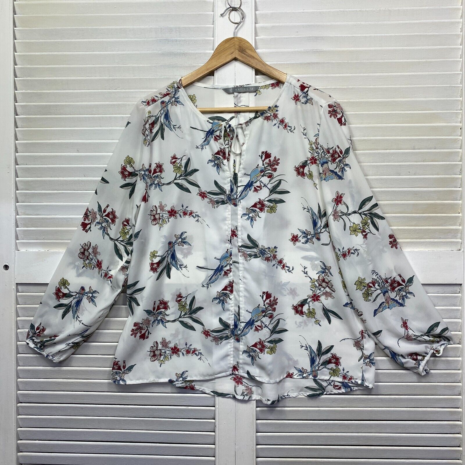 Katies Top Size 14 White Floral Long Sleeve Sheer Birds
