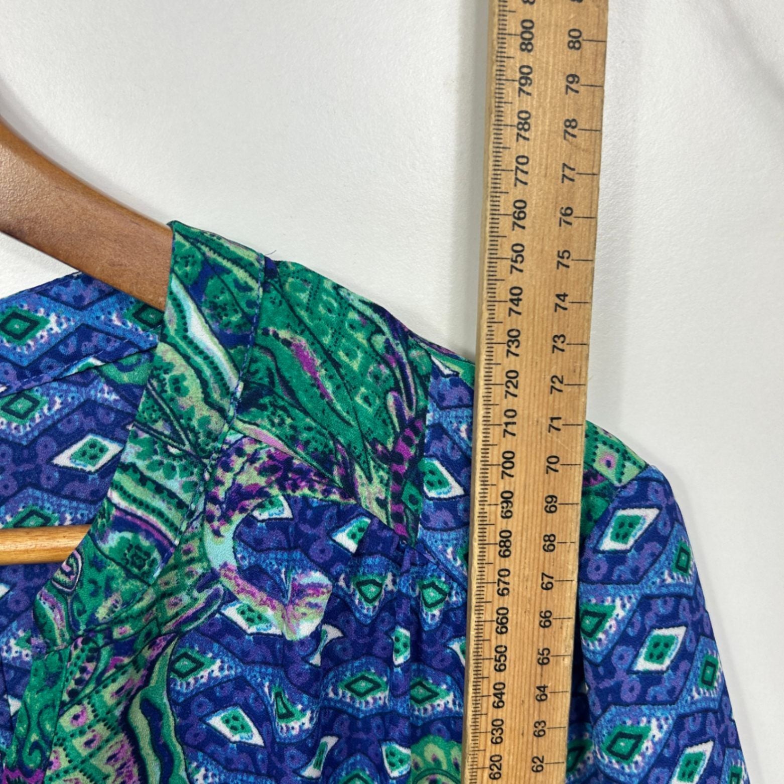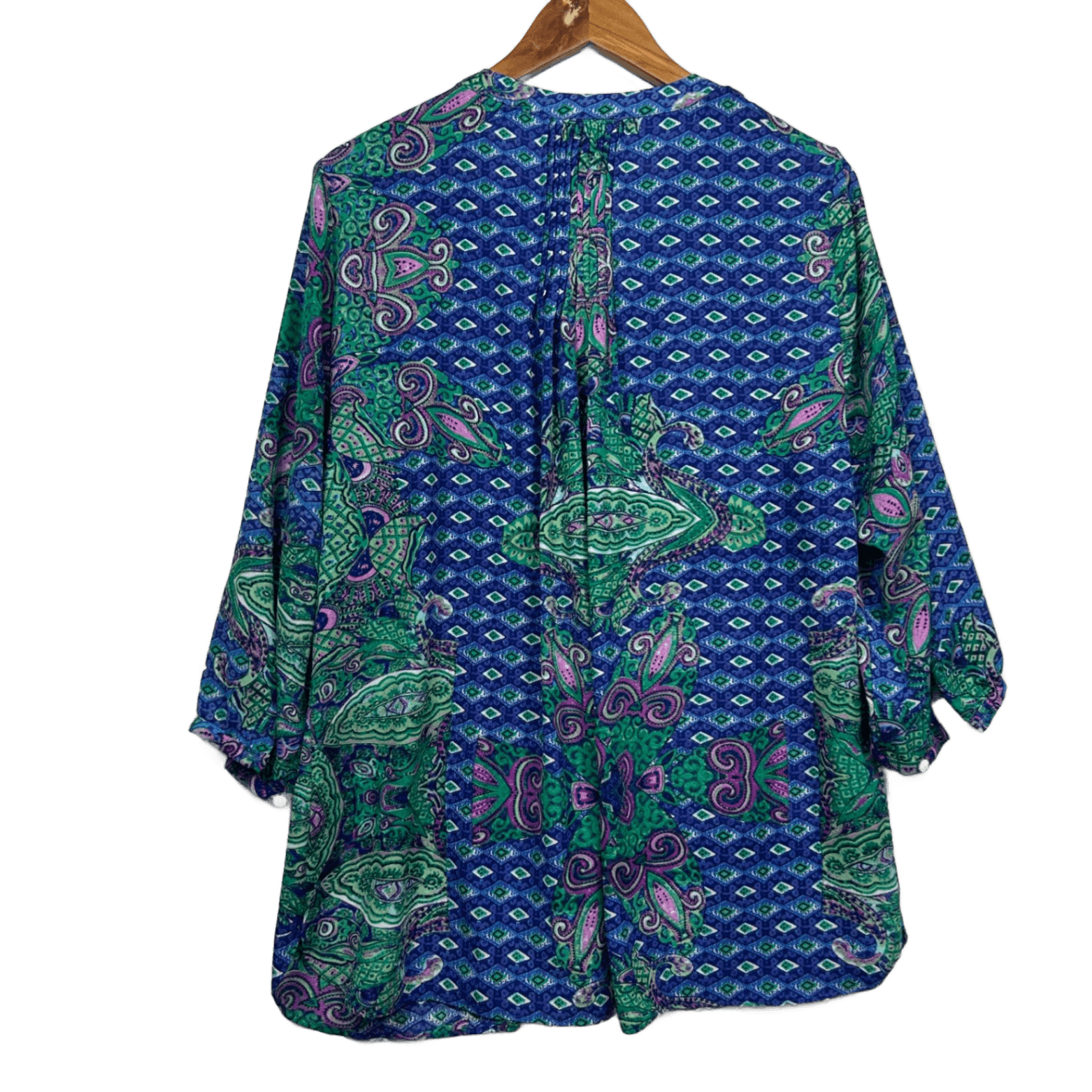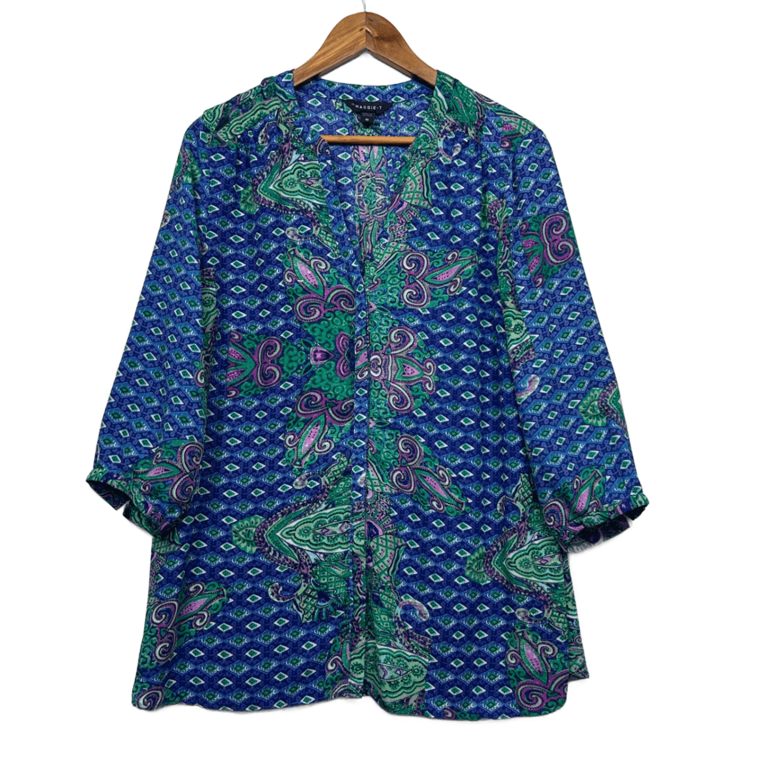 Maggie T Blouse Top Size 16 Blue Long Sleeve Paisley Print Pleated Polyester