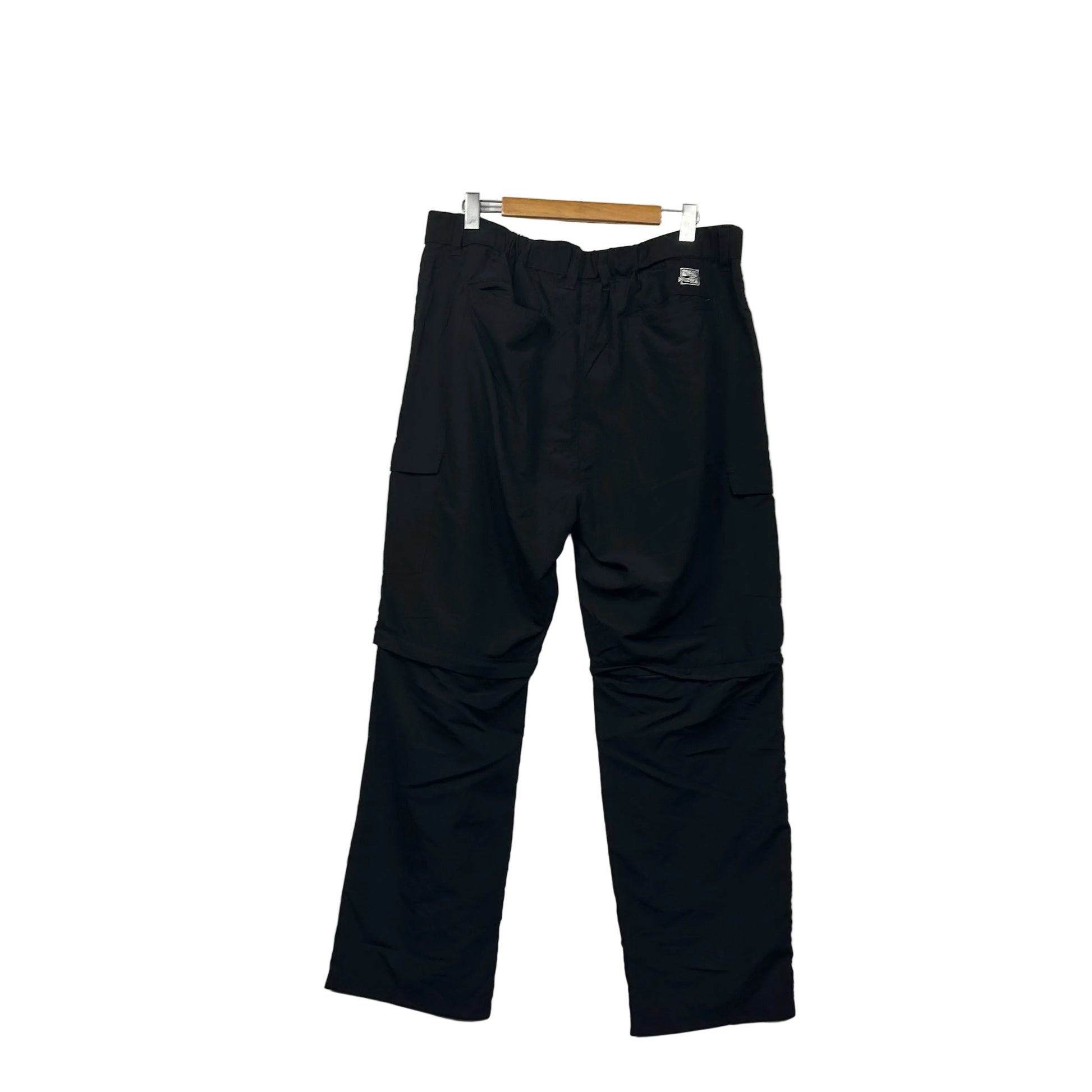 Black cargo pants with multiple pockets and adjustable waist.