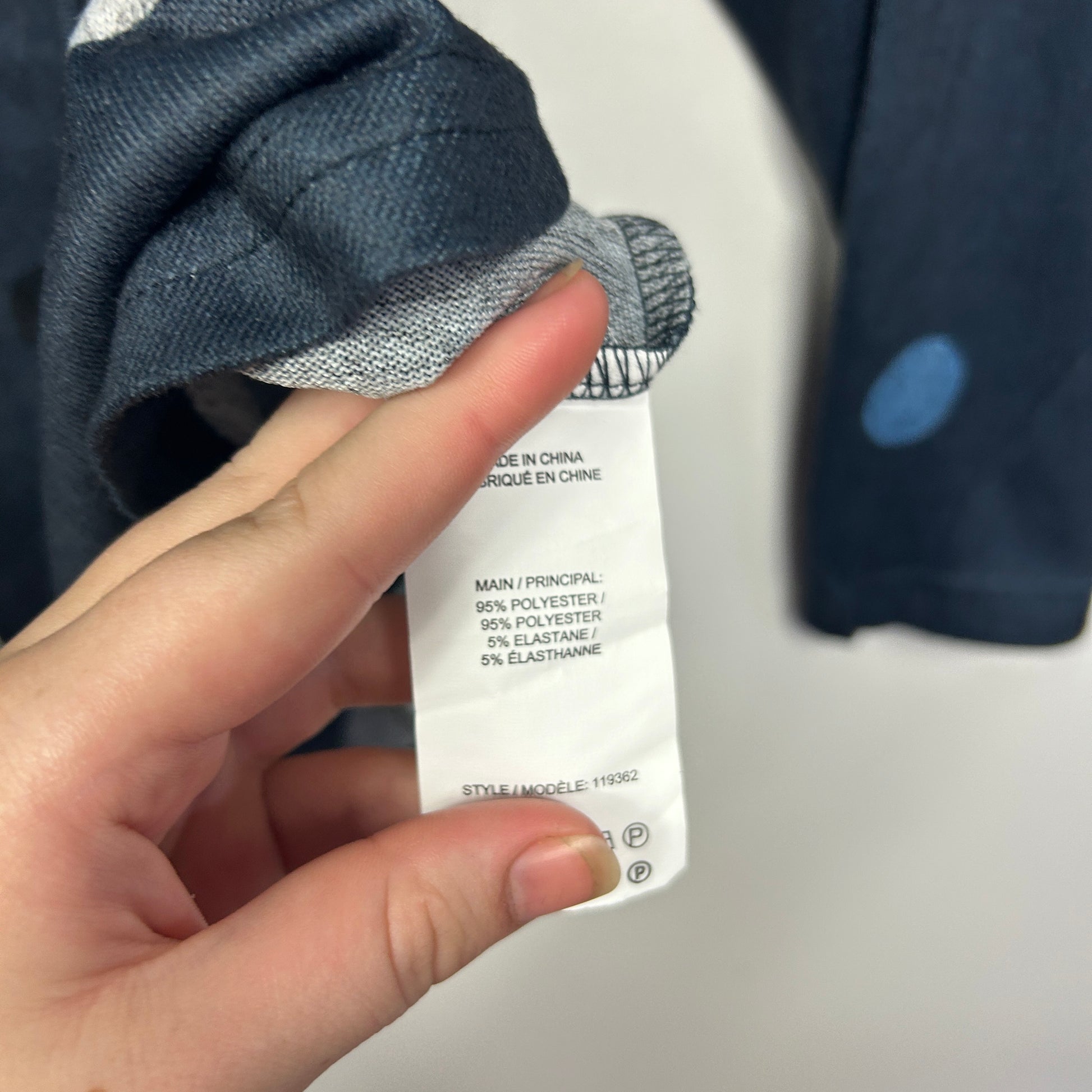 Charcoal navy top with blue and beige polka dots, boat neckline, and long sleeves.