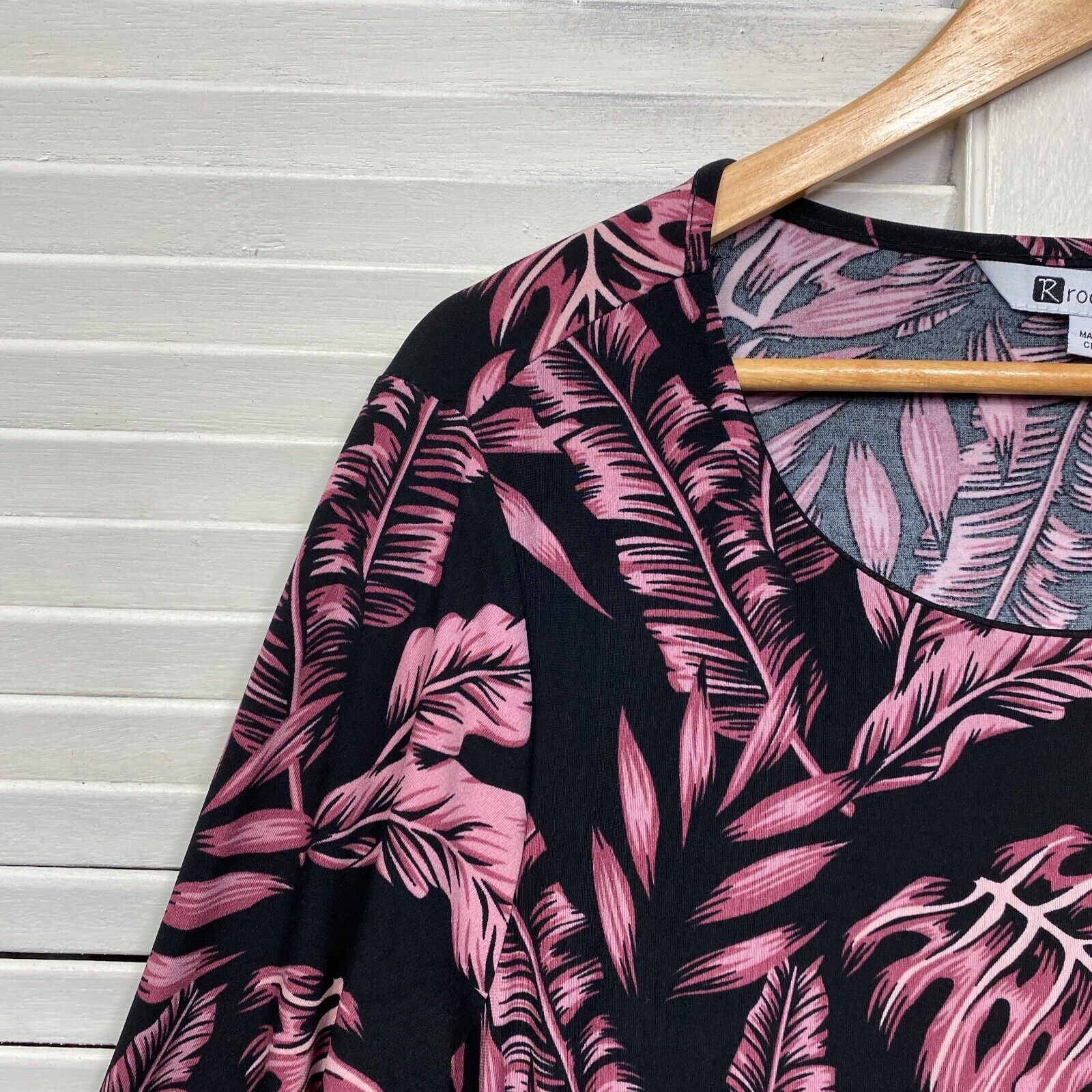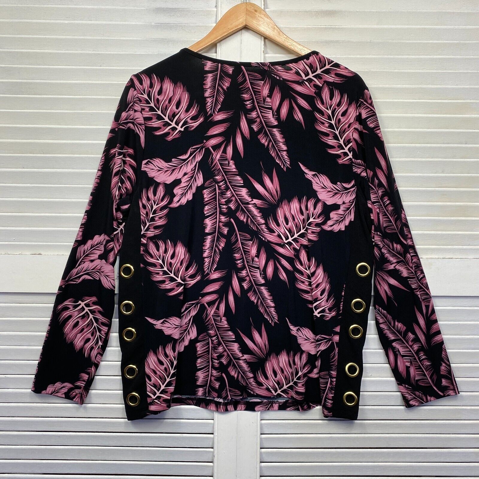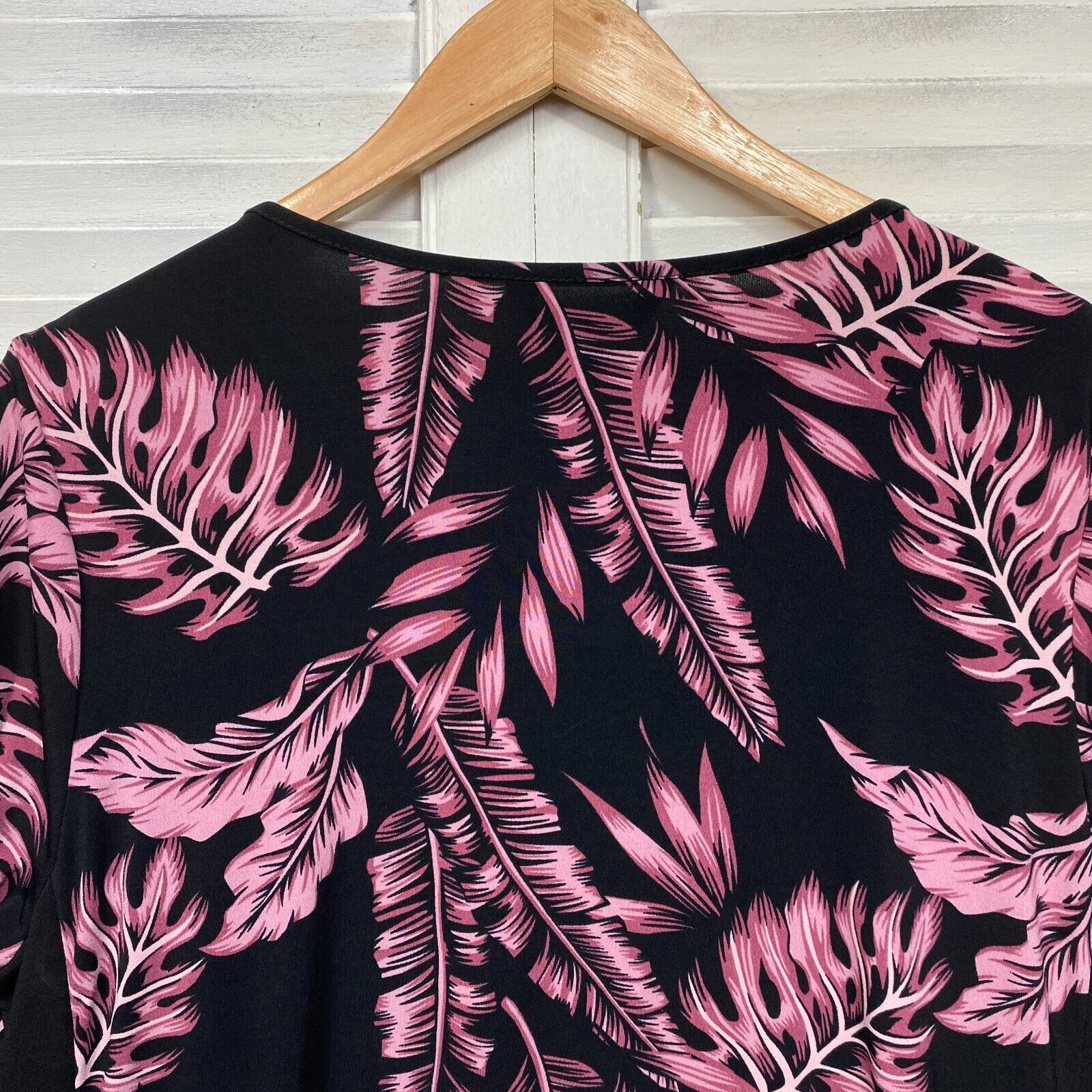 Rockmans Top Size Large Black Pink Floral Leaf Print Long Sleeve