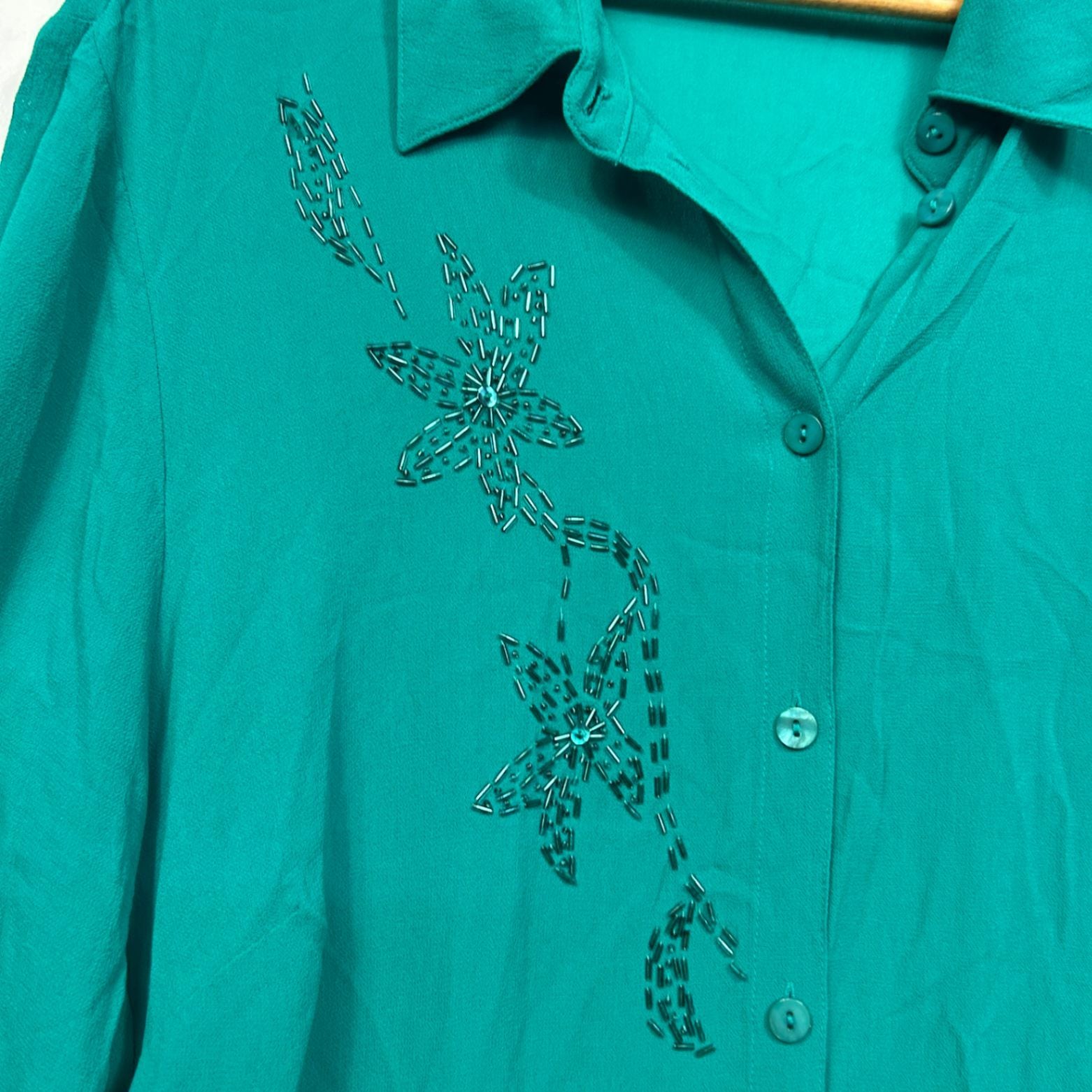 Susan Blake Button Up Green Long Sleeve Collared Beaded Shirt Blouse Size 20