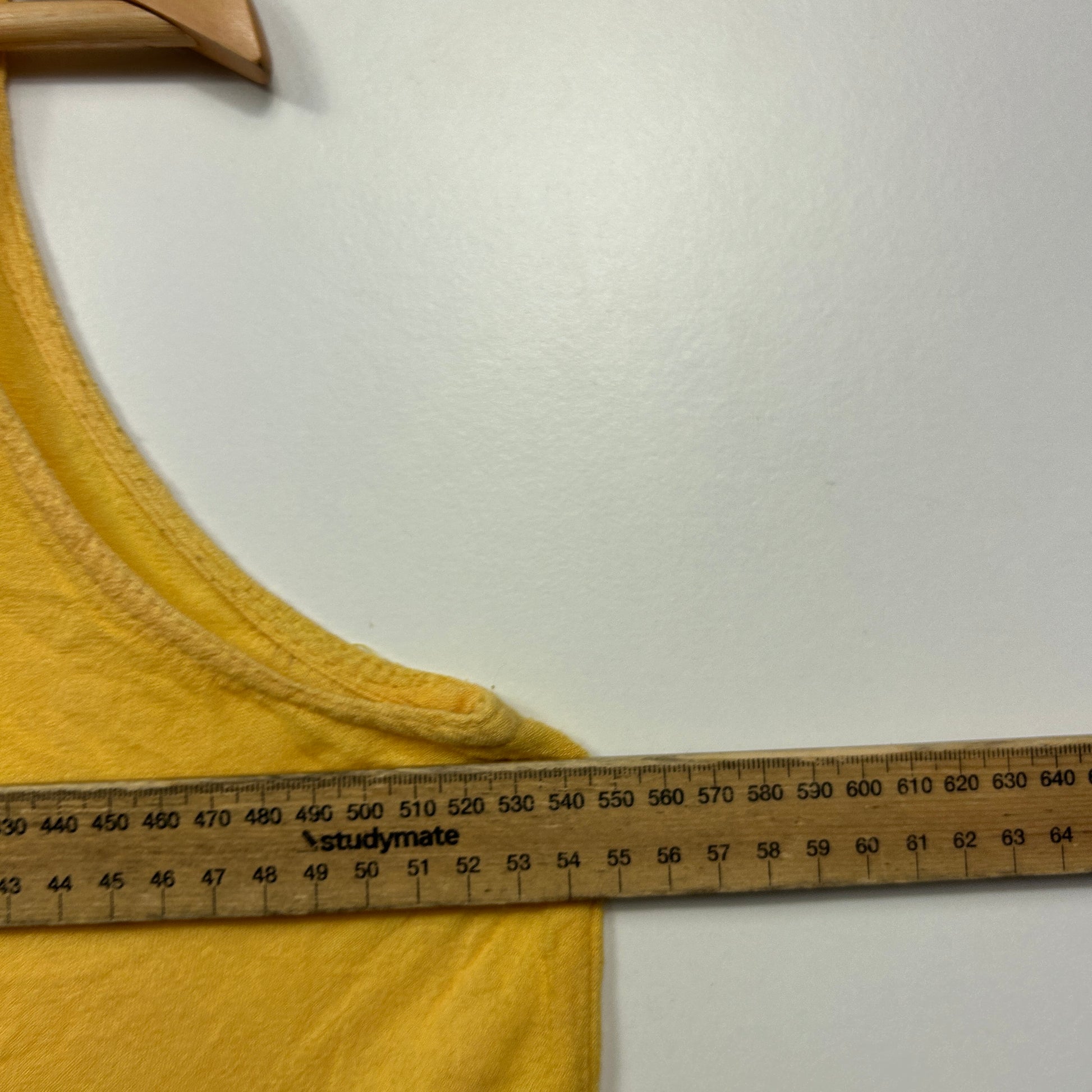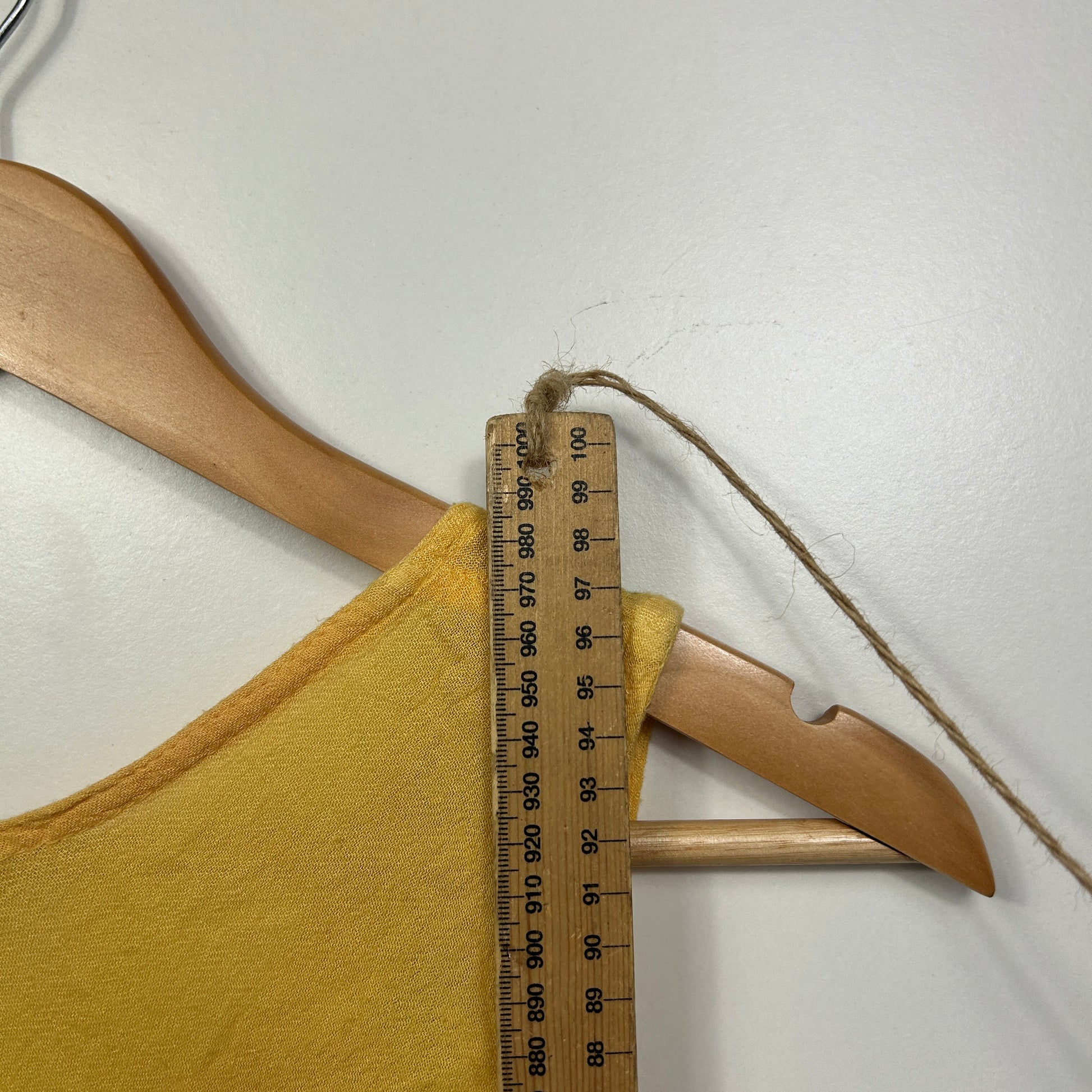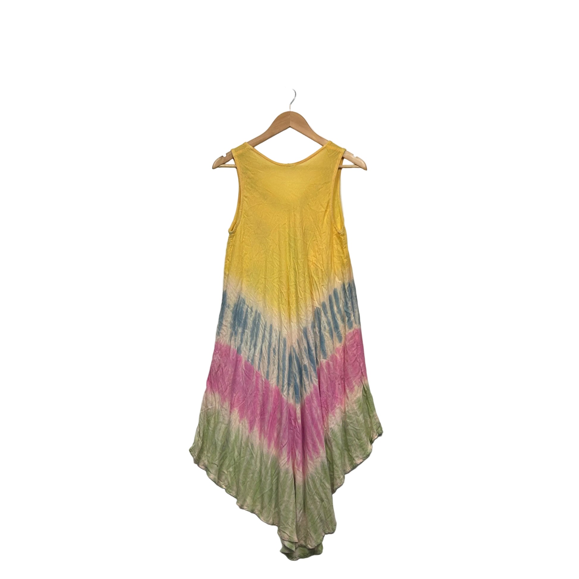 Beautiful tie-dye maxi dress with a stunning ombré gradient pattern transitioning from golden yellow at the top through grey, pink, and sage green tones, featuring hand-painted botanical floral details, sleeveless design with a round neckline, and an asymmetrical handkerchief hem.